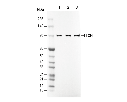 ITCH Antibody [K4F16] recognizes endogenous levels of total ITCH protein.