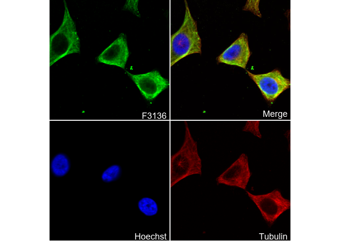 • Immunofluorescent analysis of Hela cells using F3136 (green, 1:50), Hoechst (blue) and tubulin (Red).