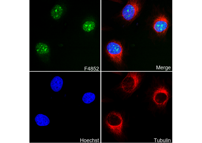 • Immunofluorescent analysis of Hela cells using F4852 (green, 1:2000), Hoechst (blue) and tubulin (Red).