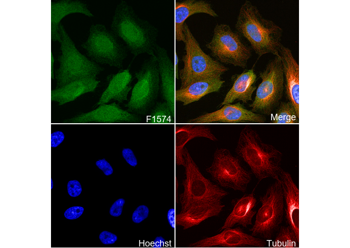 • Immunofluorescent analysis of Hela cells using F1574 (green, 1:250), Hoechst (blue) and tubulin (Red).