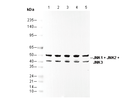JNK1 + JNK2 + JNK3 Antibody [M18P18] recognizes endogenous levels of total JNK1 + JNK2 + JNK3protein.