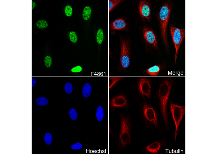 • Immunofluorescent analysis of Hela cells using F4861 (green, 1:10000), Hoechst (blue) and tubulin (Red).