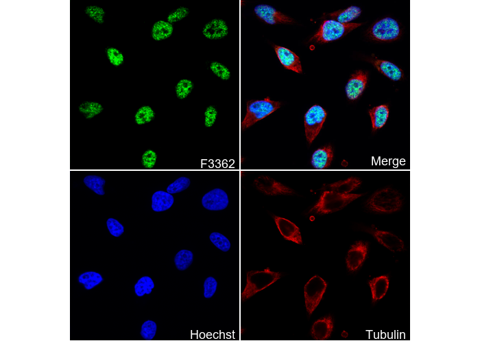 • Immunofluorescent analysis of Hela cells using F3362 (green, 1:450), Hoechst (blue) and tubulin (Red).