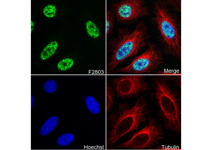 • Immunofluorescent analysis of Hela cells using F2803 (green, 1:1000), Hoechst (blue) and tubulin (Red).