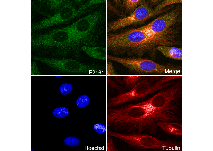 • Immunofluorescent analysis of Hela cells using F2161 (green, 1:100), Hoechst (blue) and tubulin (Red).