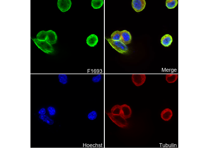 • Immunofluorescent analysis of Neuro-2a cells using F1693 (green, 1:250), Hoechst (blue) and tubulin (Red).