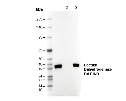 • Lane 1: HEK-293T, Lane 2: HEK-293T (KO LDHB), Lane 3: HeLa