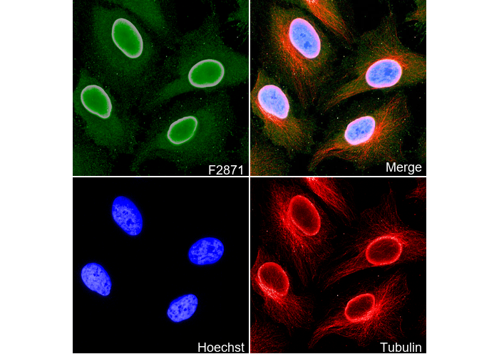 • Immunofluorescent analysis of Hela cells using F2871 (green, 1:250), Hoechst (blue) and tubulin (Red).