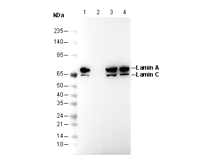 • Lane 1: HAP1 , Lane 2: HAP1 (KO Lamin A/C , Lane 3: HeLa , Lane 4: SH-SY5Y