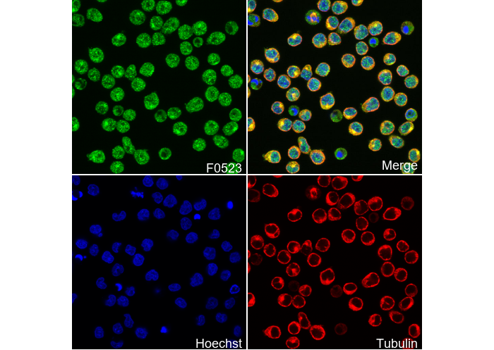 • Immunofluorescent analysis of Ramos cells using F0523 (green, 1:300), Hoechst (blue) and tubulin (Red).