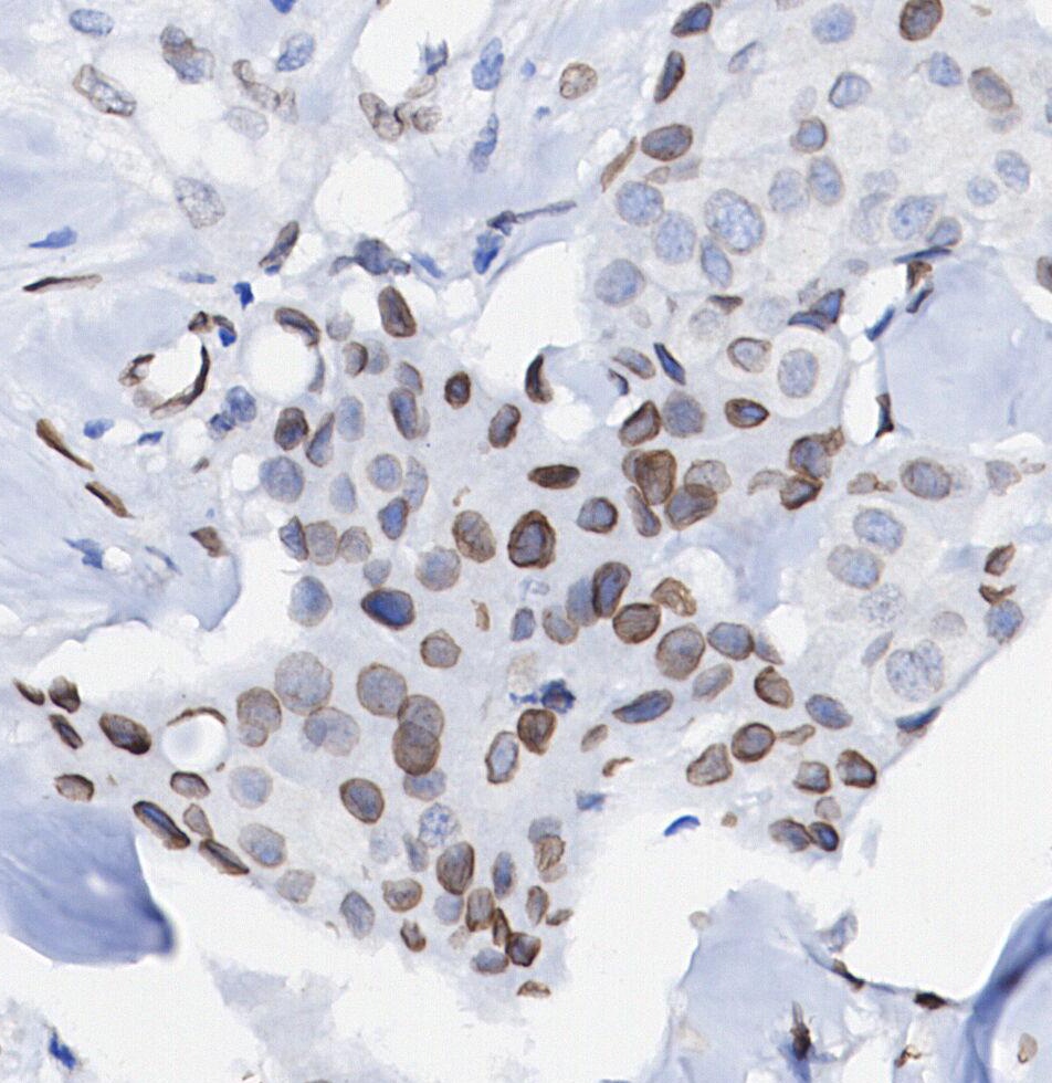 • Immunohistochemical analysis of formalin fixed paraffin embedded human breast cancer tissue with F0523 at 1/100 dilution.