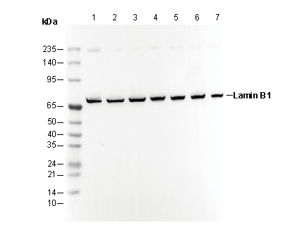 Lamin B1 Antibody [E7B10] recognizes endogenous levels of total Lamin B1 protein.