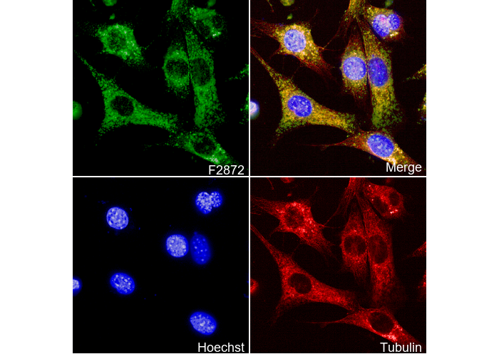 • Immunofluorescent analysis of NIH/3T3 cells using F2872 (green, 1:100), Hoechst (blue) and tubulin (Red).