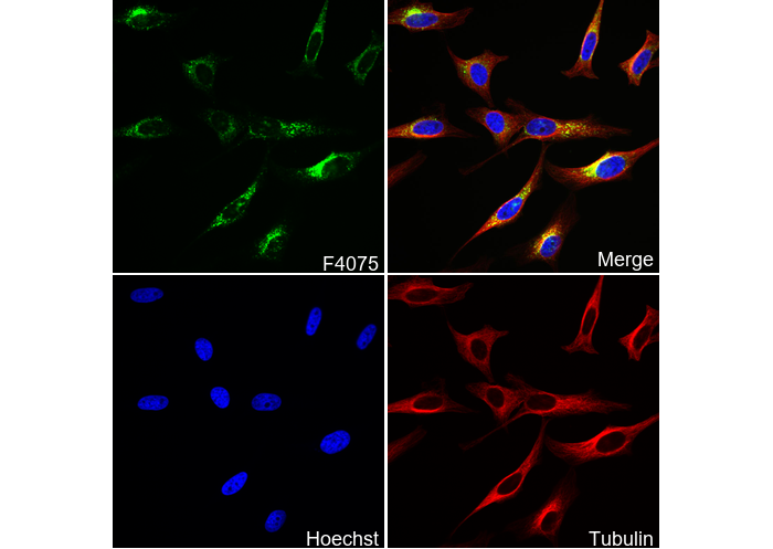 • Immunofluorescent analysis of Hela cells using F4075 (green, 1:100), Hoechst (blue) and tubulin (Red).