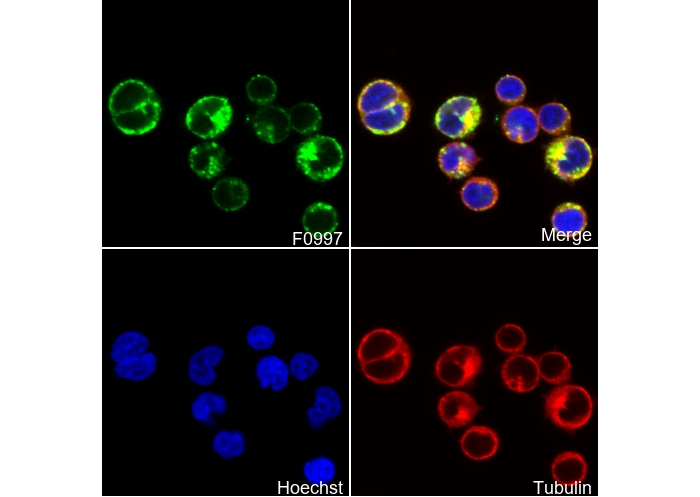 • Immunofluorescent analysis of Jurkat cells using F0997 (green, 1:50), Hoechst (blue) and tubulin (Red).