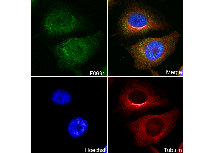 • Immunofluorescent analysis of Hela cells using F0691 (green, 1:50), Hoechst (blue) and tubulin (Red).