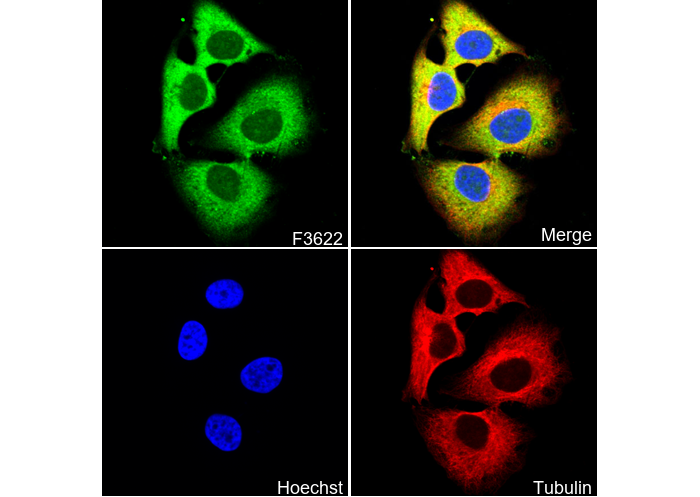 • Immunofluorescent analysis of Hela cells using F3622 (green, 1:100), Hoechst (blue) and tubulin (Red).