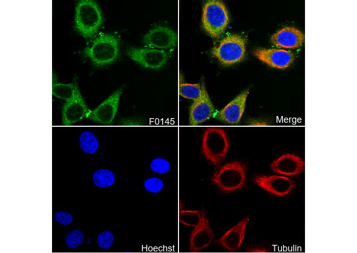 • Immunofluorescent analysis of HepG2 cells using F0145 (green, 1:1600), Hoechst (blue) and tubulin (Red).