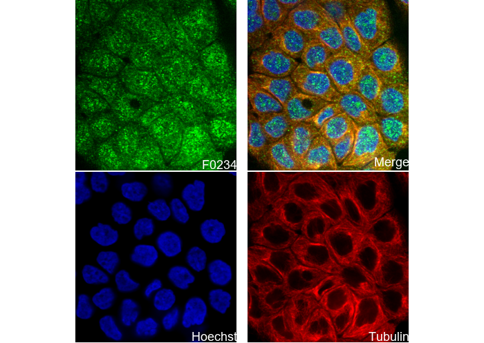 • Immunofluorescent analysis of A431 cells using F0234 (green, 1:100), Hoechst (blue) and tubulin (Red).