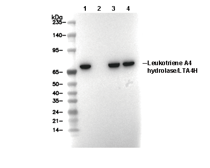 • Lane 1: HEK293T, Lane 2: HEK293T (KO LTA4H), Lane 3: Mouse brain tissue, Lane 4: Rat brain tissue