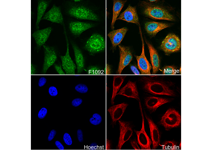 • Immunofluorescent analysis of Hela cells using F1092 (green, 1:50), Hoechst (blue) and tubulin (Red).