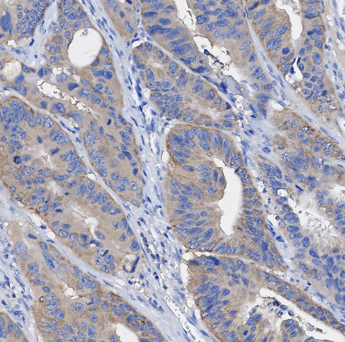• Immunohistochemical analysis of formalin fixed paraffin embedded human Colorectal cancer tissue with F1092 at 1/200 dilution.