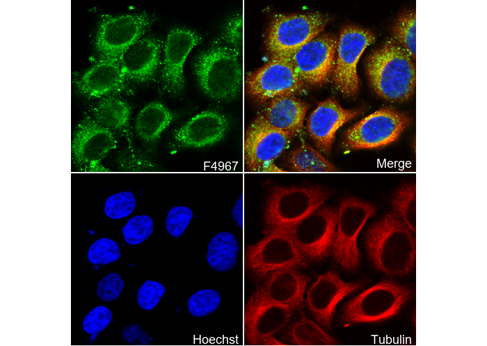 • Immunofluorescent analysis of HepG2 cells using F4967 (green, 1:50), Hoechst (blue) and tubulin (Red).