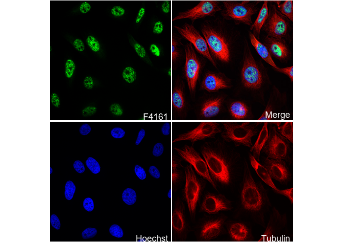 • Immunofluorescent analysis of Hela cells using F4161 (green, 1:100), Hoechst (blue) and tubulin (Red).