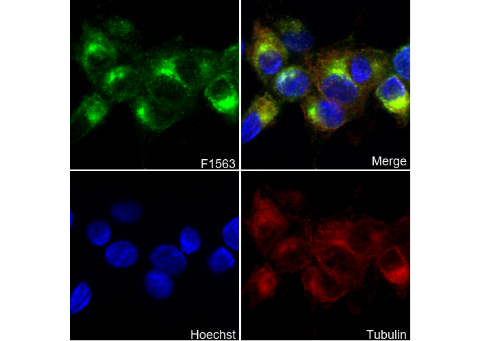 • Immunofluorescent analysis of U87-MG cells using F1563 (green, 1:100), Hoechst (blue) and tubulin (Red).
