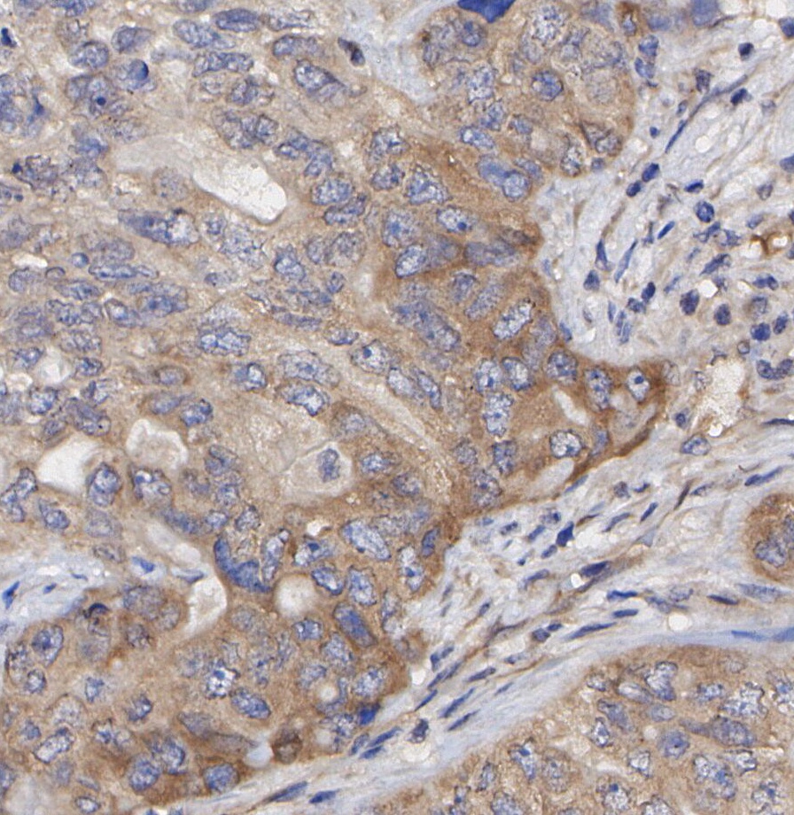 • Immunohistochemical analysis of formalin fixed paraffin embedded human Lung adenocarcinoma tissue with F1040 at 1/100 dilution.