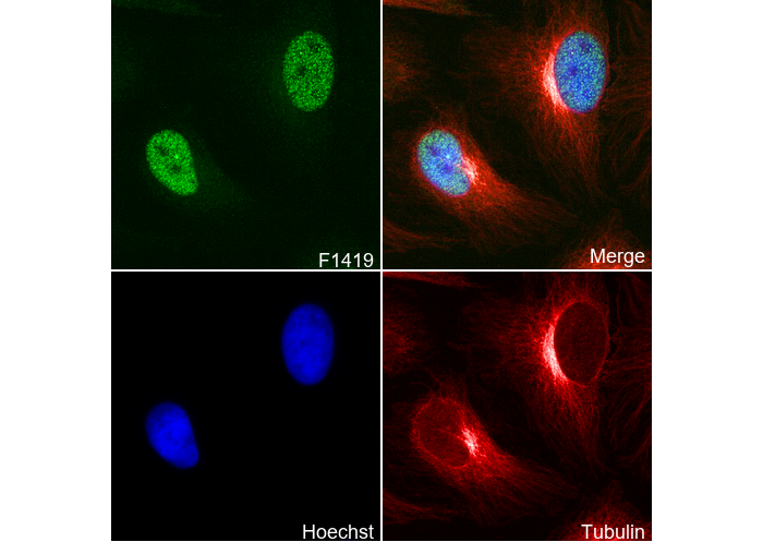 • Immunofluorescent analysis of Hela cells using F1419 (green, 1:200), Hoechst (blue) and tubulin (Red).