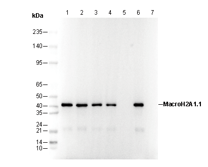 • Lane 1: mouse kudney , Lane 2: mouse colon , Lane 3: human liver , Lane 4: mouse liver , Lane 5: 293 , Lane 6: 293 (hMacroH2A1-DDK)