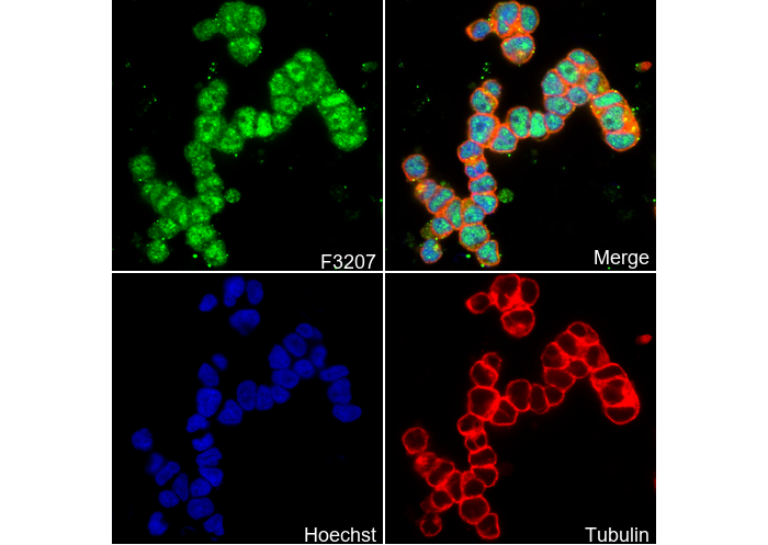 • Immunofluorescent analysis of NCI-H69 cells using F3207 (green, 1:100), Hoechst (blue) and tubulin (Red).