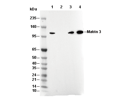 • Lane 1: Hela, Lane 2: Hela (KO MATR3), Lane 3: MCF-7, Lane 4: HepG2