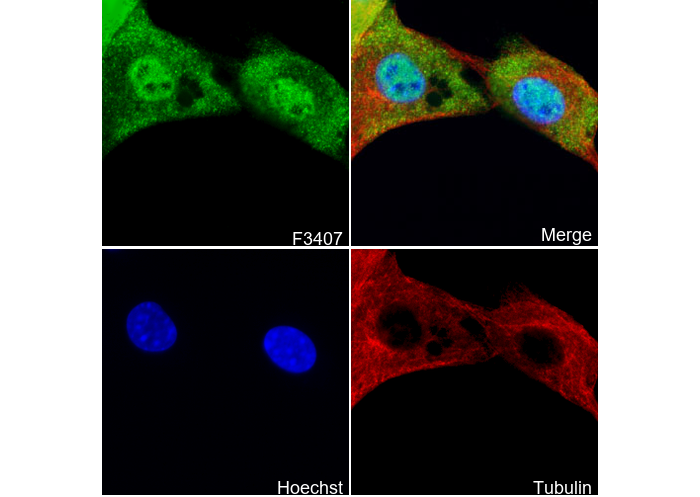 • Immunofluorescent analysis of C2C12 cells using F3407 (green, 1:500), Hoechst (blue) and tubulin (Red).