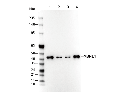 • Lane 1: Jurkat , Lane 2: Jurkat (transfected with MBNL1 siRNA 1) , Lane 3: Jurkat (transfected with MBNL1 siRNA 2) , Lane 4: Mouse heart