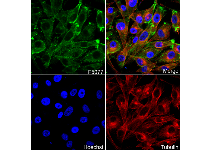 • Immunofluorescent analysis of SK-MEL-28 cells using F5077 (green, 1:800 ), Hoechst (blue) and tubulin (Red).