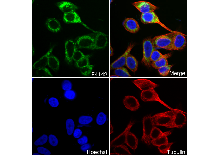 • Immunofluorescent analysis of MCF-7 cells using F4142 (green, 1:400 ), Hoechst (blue) and tubulin (Red).