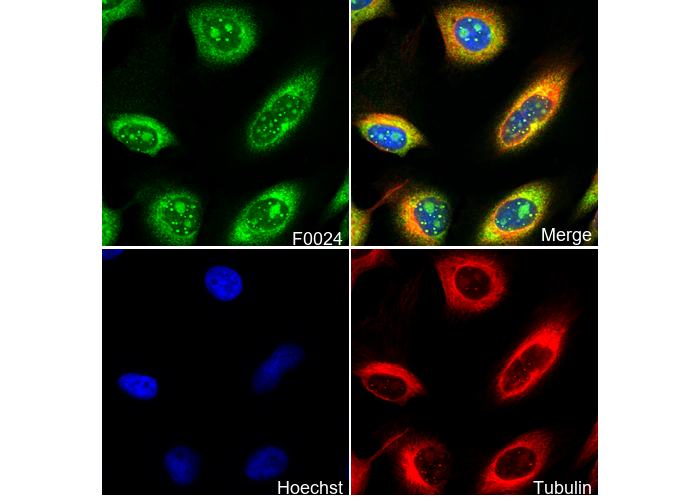 • Immunofluorescent analysis of Hela cells using F0024 (green, 1:100), Hoechst (blue) and tubulin (Red).