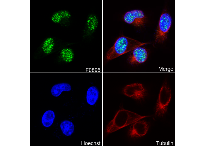 • Immunofluorescent analysis of COS-7 cells using F0895 (green, 1:100), Hoechst (blue) and tubulin (Red).
