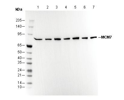 MCM7 Antibody [P5C3] detects endogenous levels of total MCM7 protein. Western blot analysis and immunofluorescent data indicate that the antibody is more reactive to primate than rodent proteins.