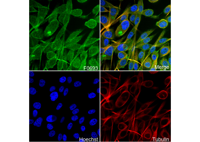 • Immunofluorescent analysis of PC-3 cells using F0693 (green, 1:200), Hoechst (blue) and tubulin (Red).