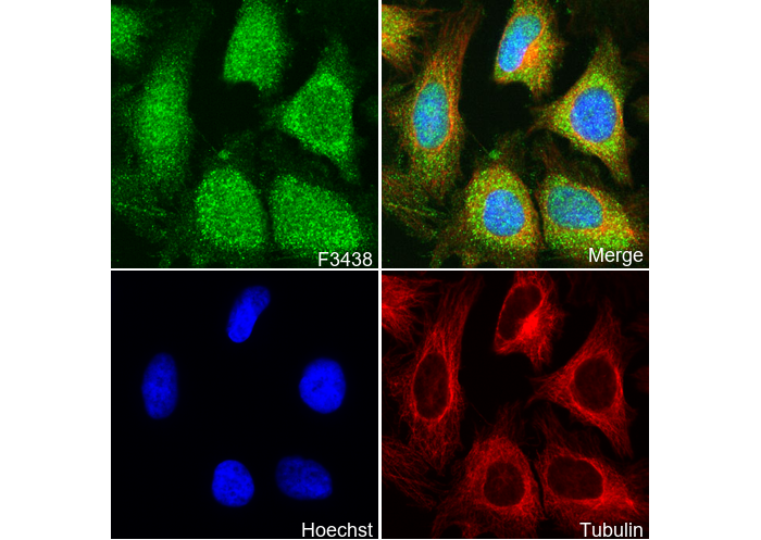 • Immunofluorescent analysis of Hela cells using F3438 (green, 1:50), Hoechst (blue) and tubulin (Red).