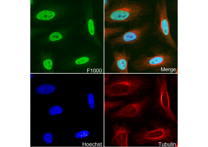 • Immunofluorescent analysis of Hela cells using F1000 (green, 1:1000), Hoechst (blue) and tubulin (Red).