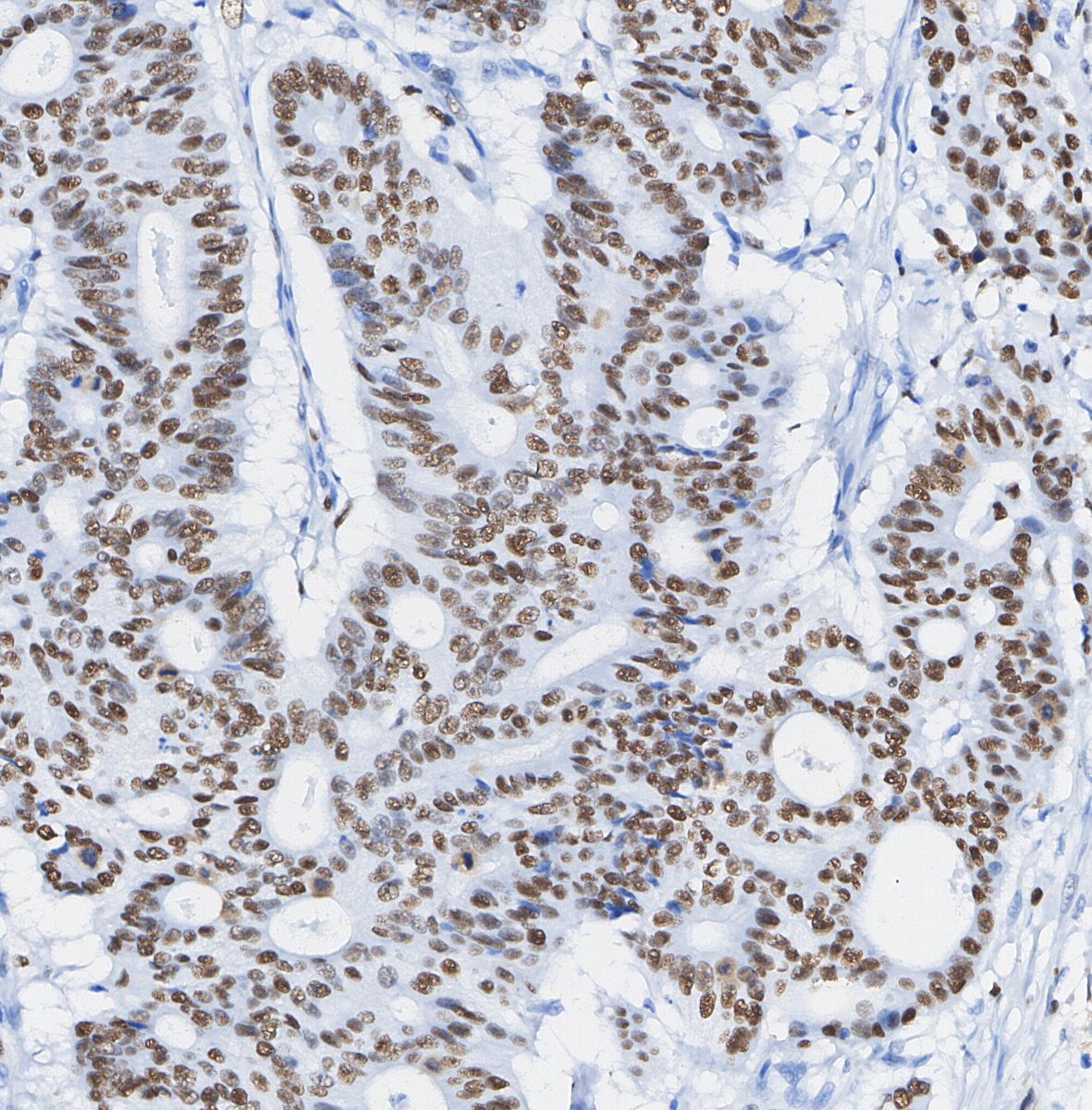 • Immunohistochemical analysis of formalin fixed paraffin embedded human Colorectal cancer tissue with F1000 at 1/100 dilution.