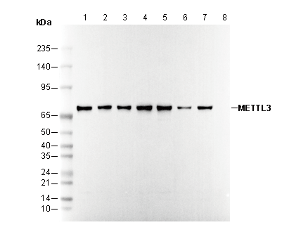 • Lane 1: Raji , Lane 2: HEK-293 , Lane 3: NCCIT , Lane 4: C2C12 , Lane 5: F9 , Lane 6: Neuro-2a , Lane 7: Mouse embryonic stem cells , Lane 8: Mouse embryonic stem cells (METTL3 KO)