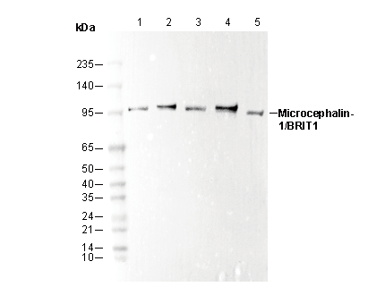Microcephalin-1/BRIT1 Antibody [N5J16] detects endogenous levels of total Microcephalin-1/BRIT1 protein.