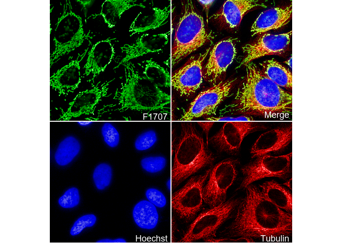 • Immunofluorescent analysis of Hela cells using F1707 (green, 1:800), Hoechst (blue) and tubulin (Red).