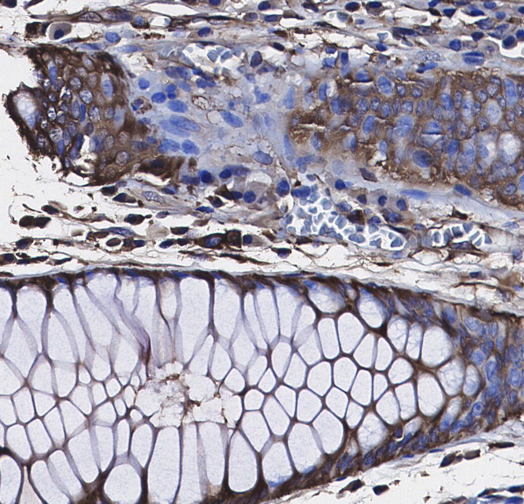 • Immunohistochemical analysis of formalin fixed paraffin embedded human Colorectal cancer tissue with F1707 at 1/100 dilution.