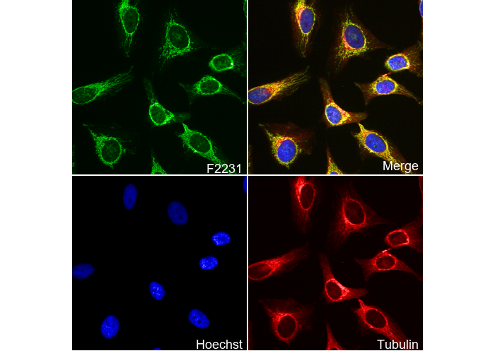• Immunofluorescent analysis of Hela cells using F2231 (green, 1:100), Hoechst (blue) and tubulin (Red).